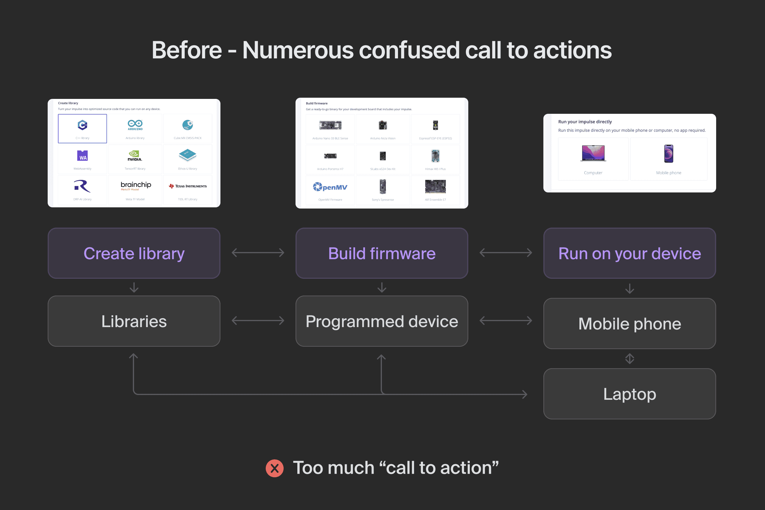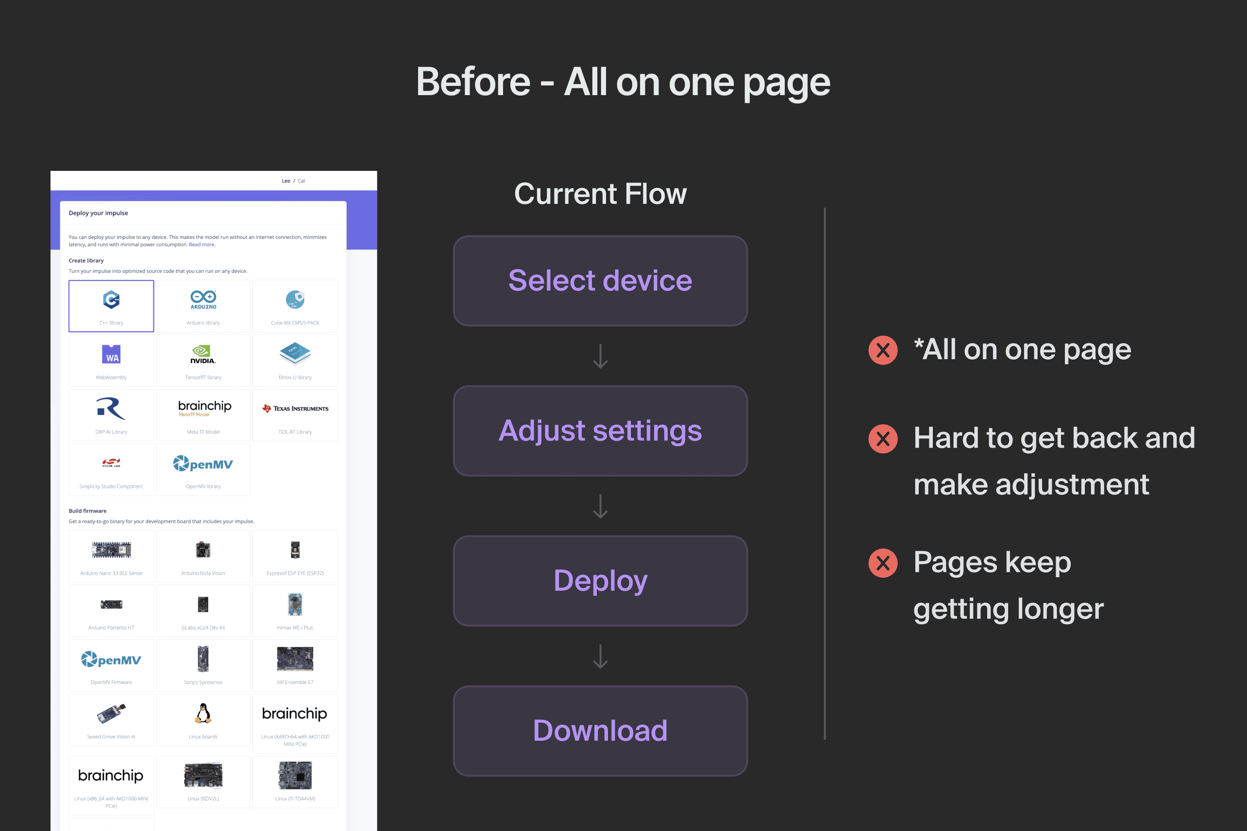 After extensive interviews and research with users, engineers, and designers, I identified two main issues with the current deployment flow: