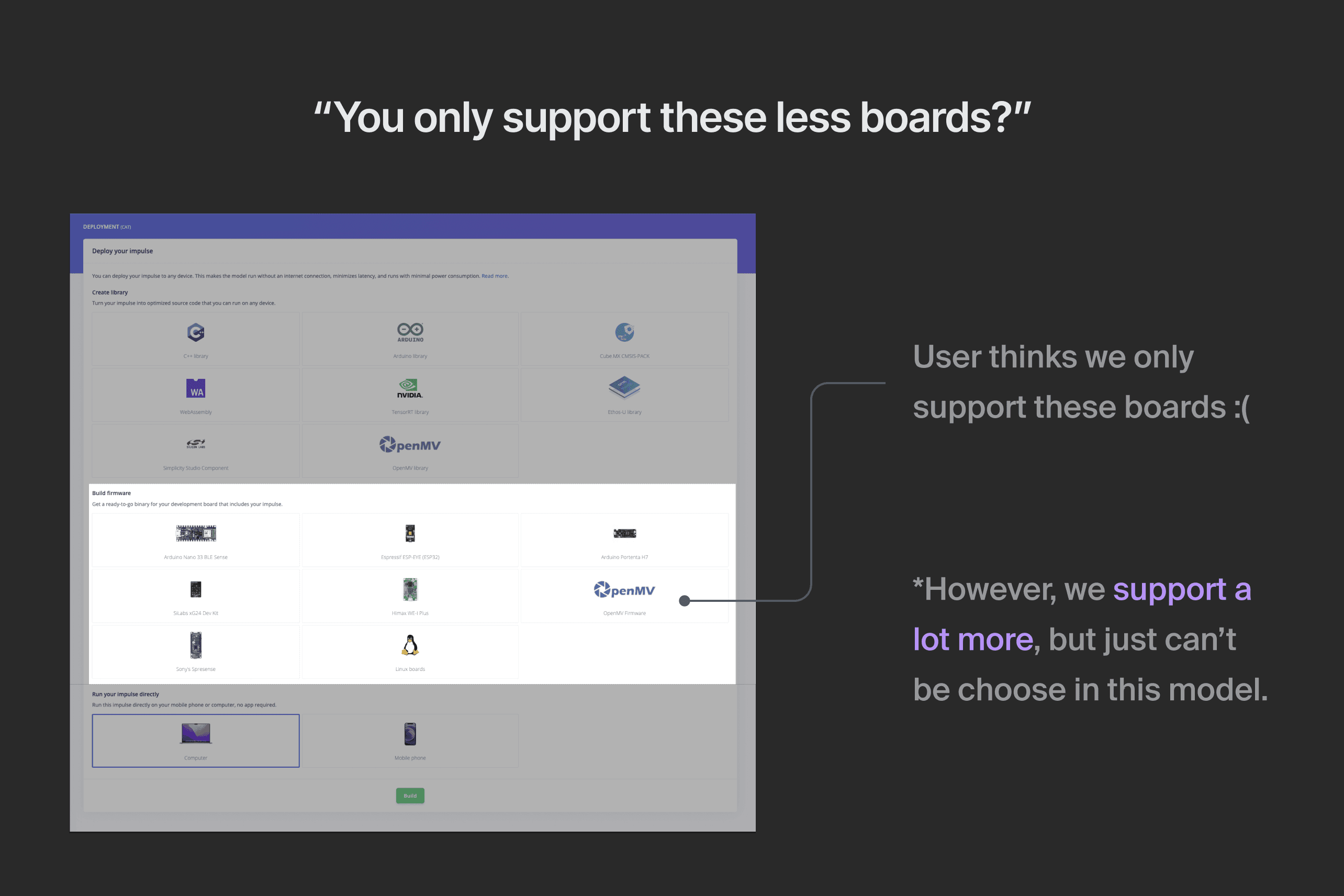 The deployment page lacked messaging to indicate that users could work with any hardware. Many users believed we only supported the small number of boards listed, since those were the only ones shown.