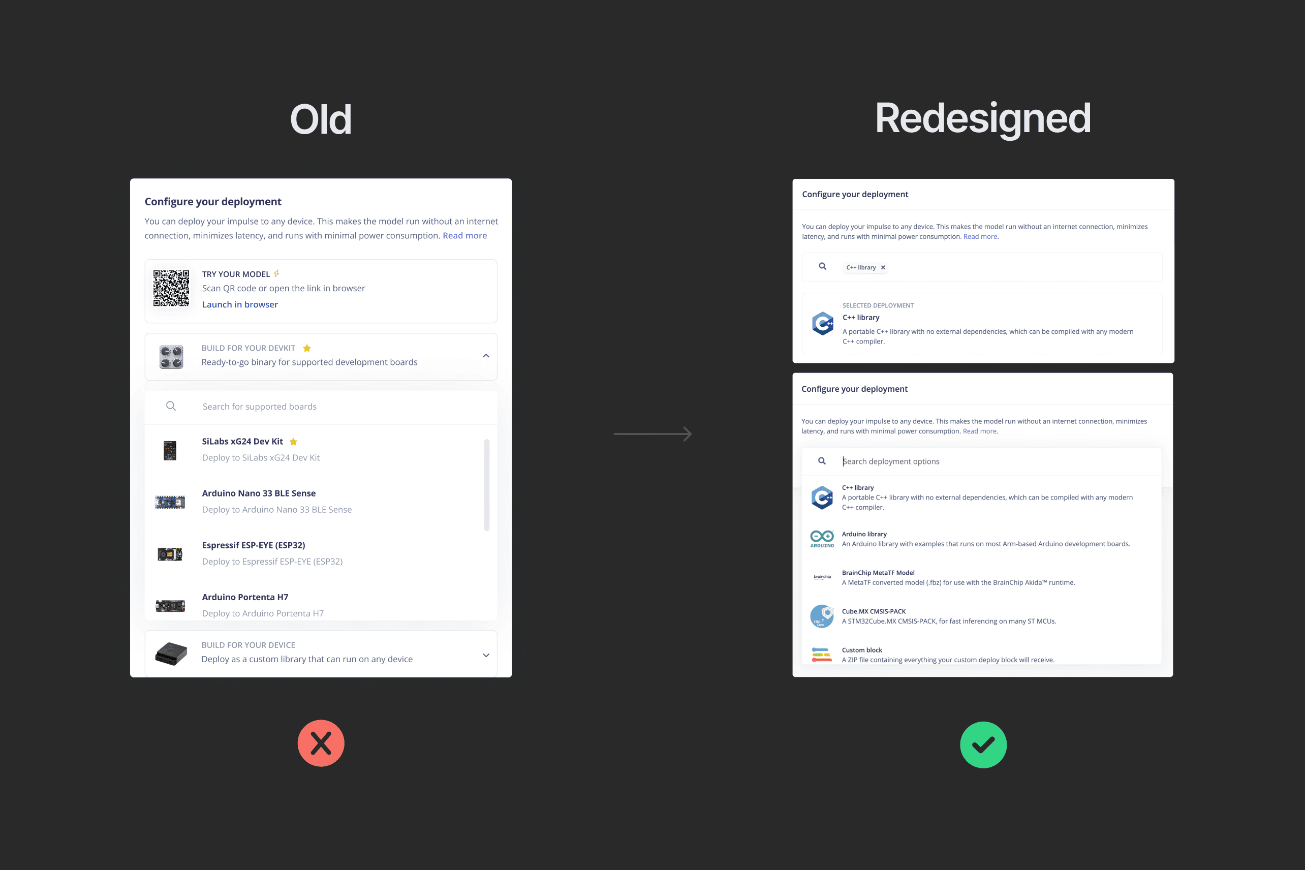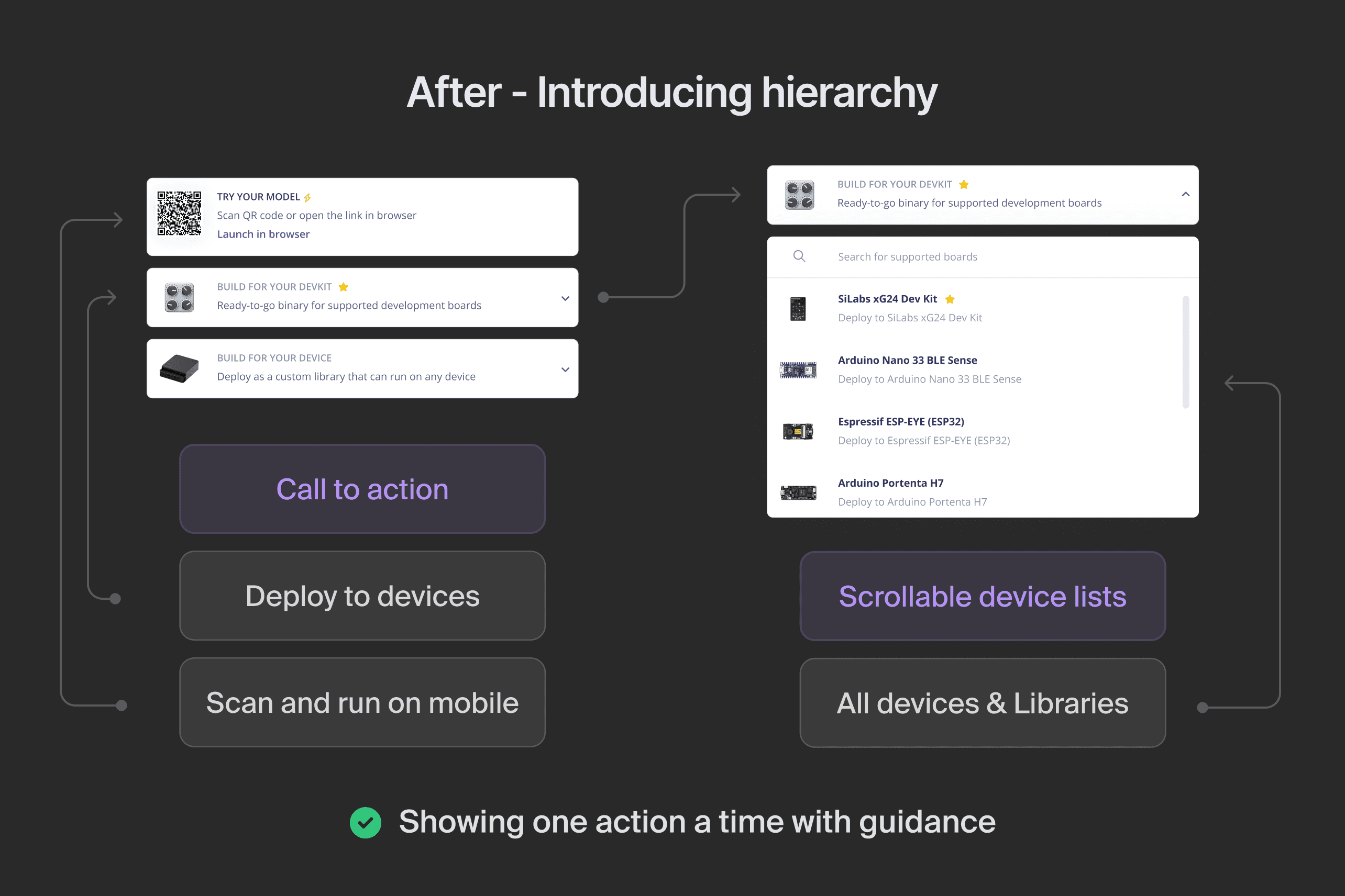 The redesigned device list still had three main categories for users to choose from. Based on testing insights, users were still confused or spent extra time testing different options. As a result, we made another change - removing the three categories and providing only one search bar. With this, users can find everything they need in one list, whether searching for a board or library, streamlining the process.