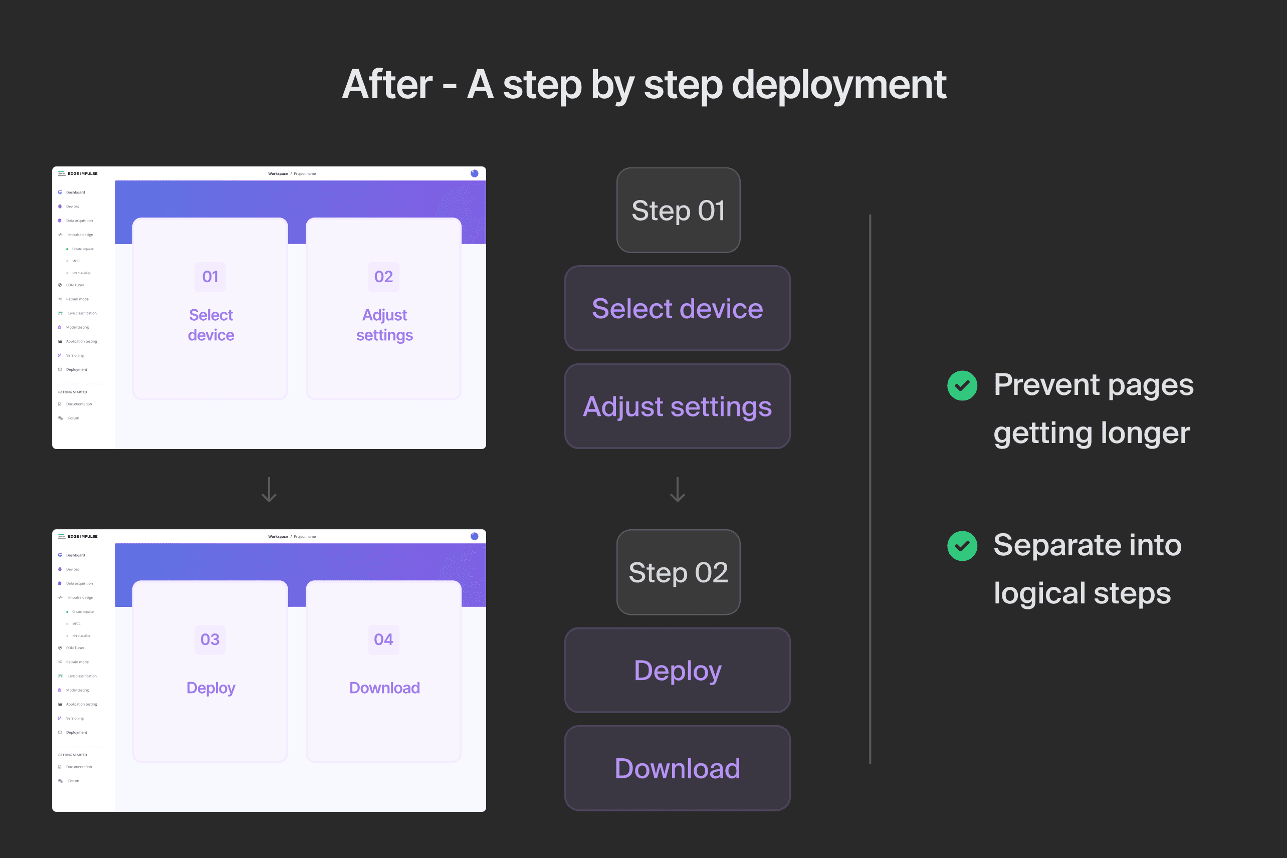 Rather than having one long page for deployment, I separated the process into two pages to be completed step-by-step. This maintained the original user flow while preventing the deployment page from becoming overwhelmingly long. The new two-page concept provides users more flexibility to go back and forth and make adjustments easily.