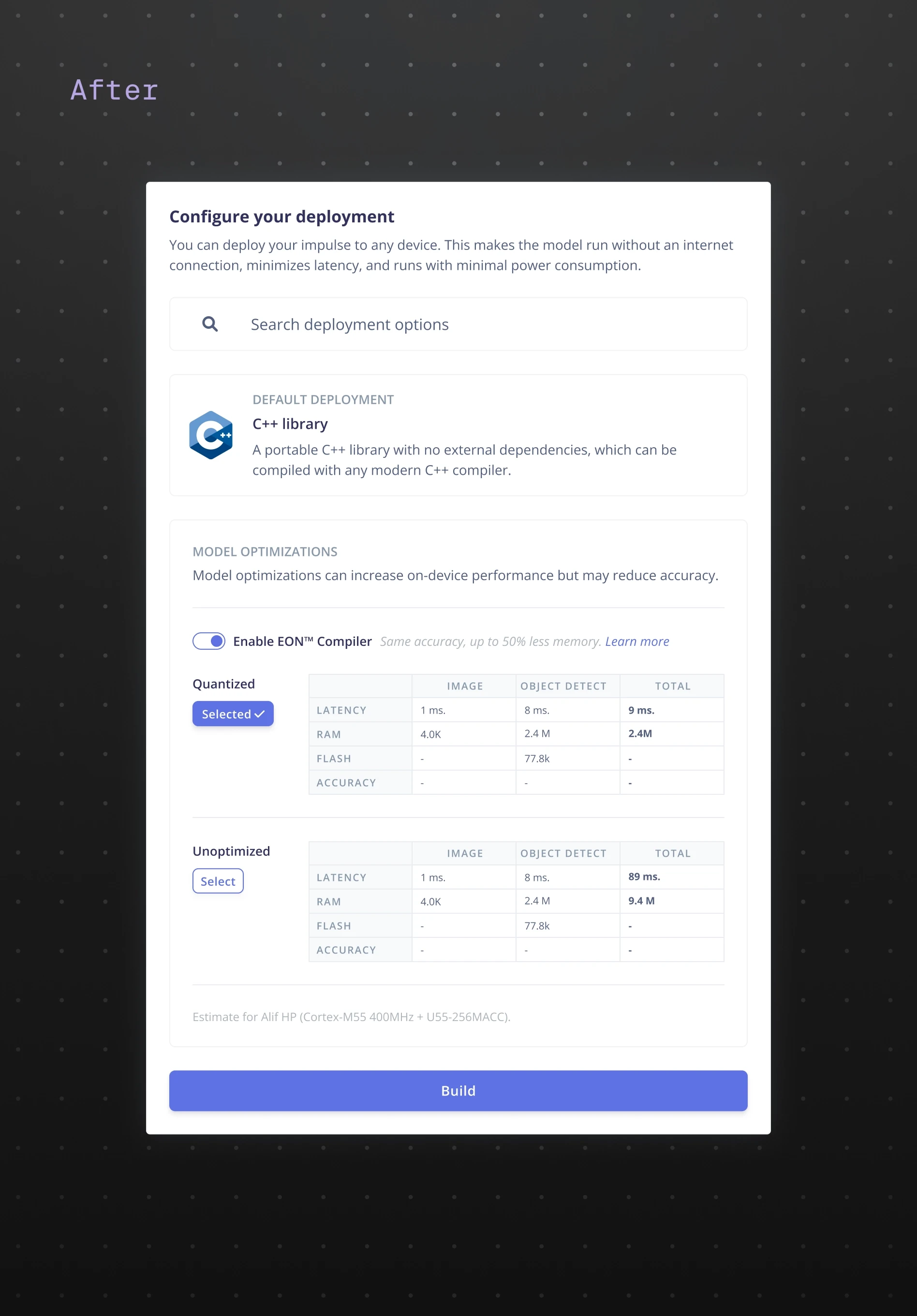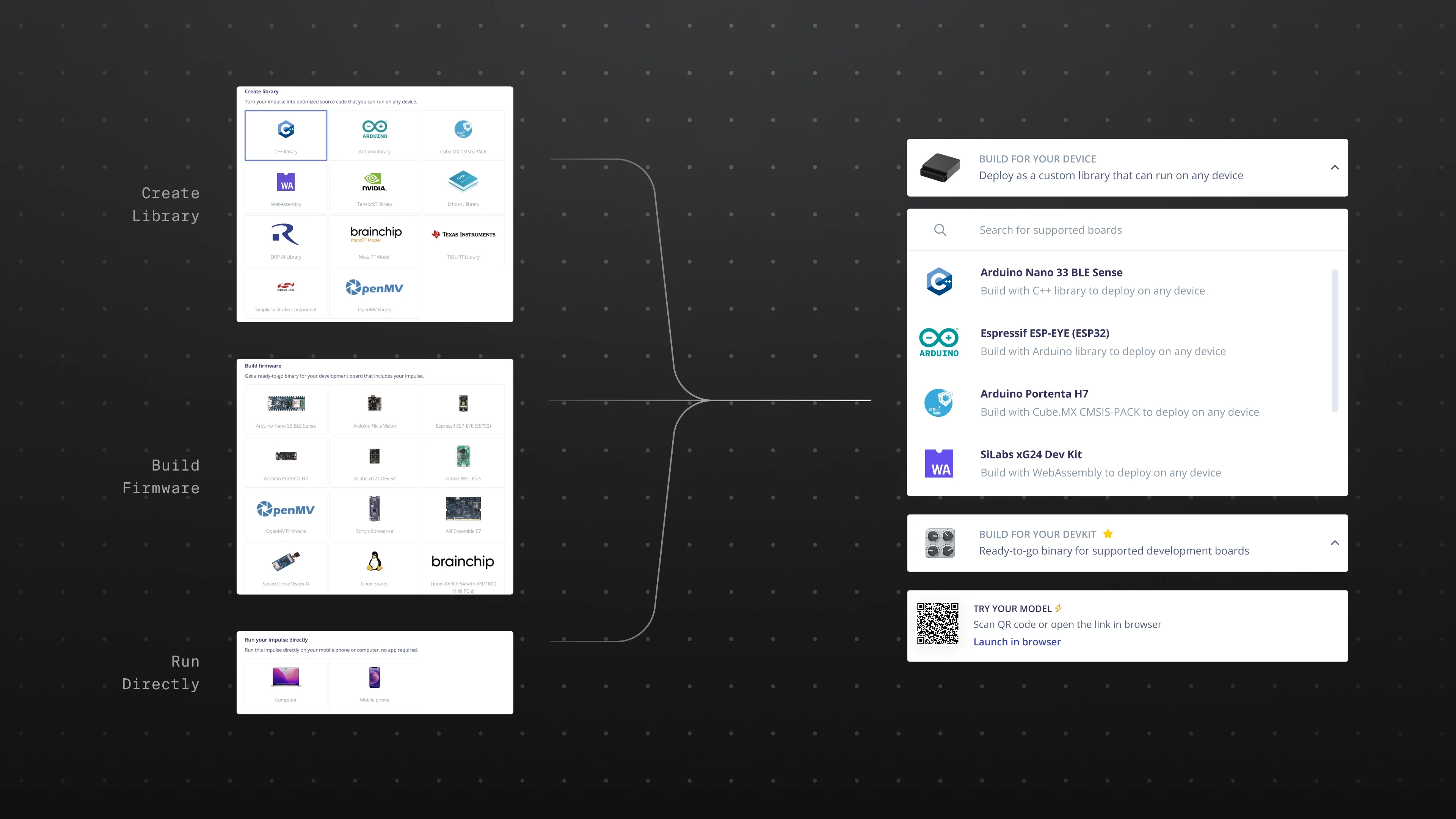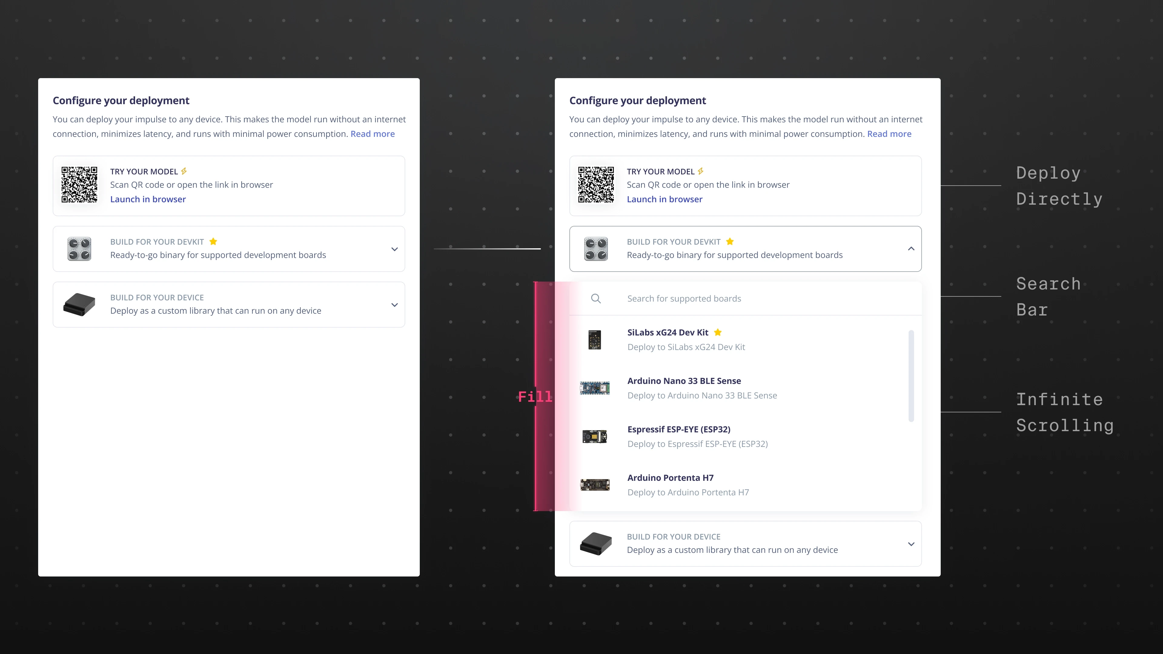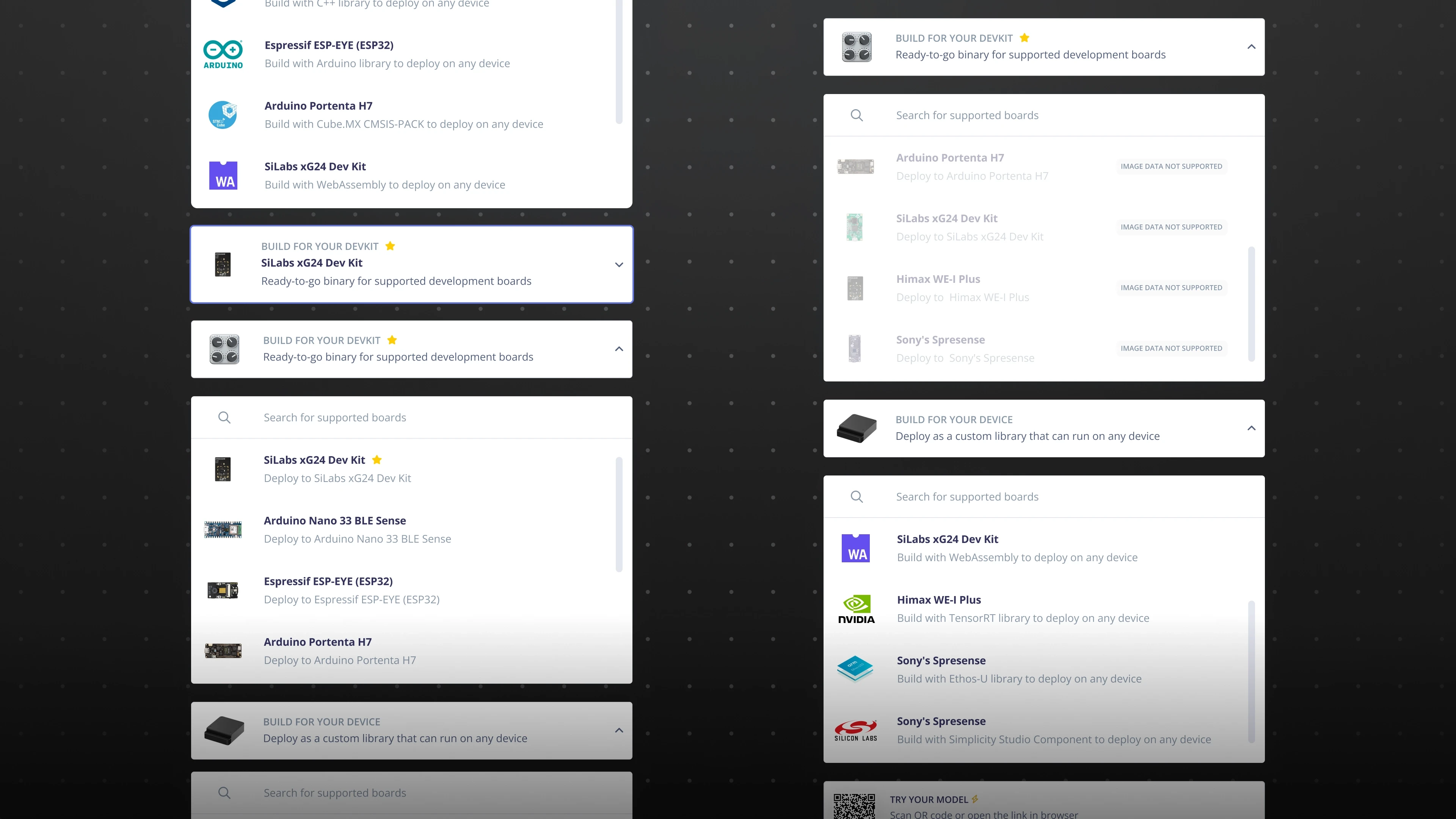 I redesigned the deployment entry to better highlight supported hardware and formats. Boards were surfaced more clearly with recognizable hardware visuals and clearer grouping. Developers could now quickly identify compatible boards instead of searching through documentation or guessing.