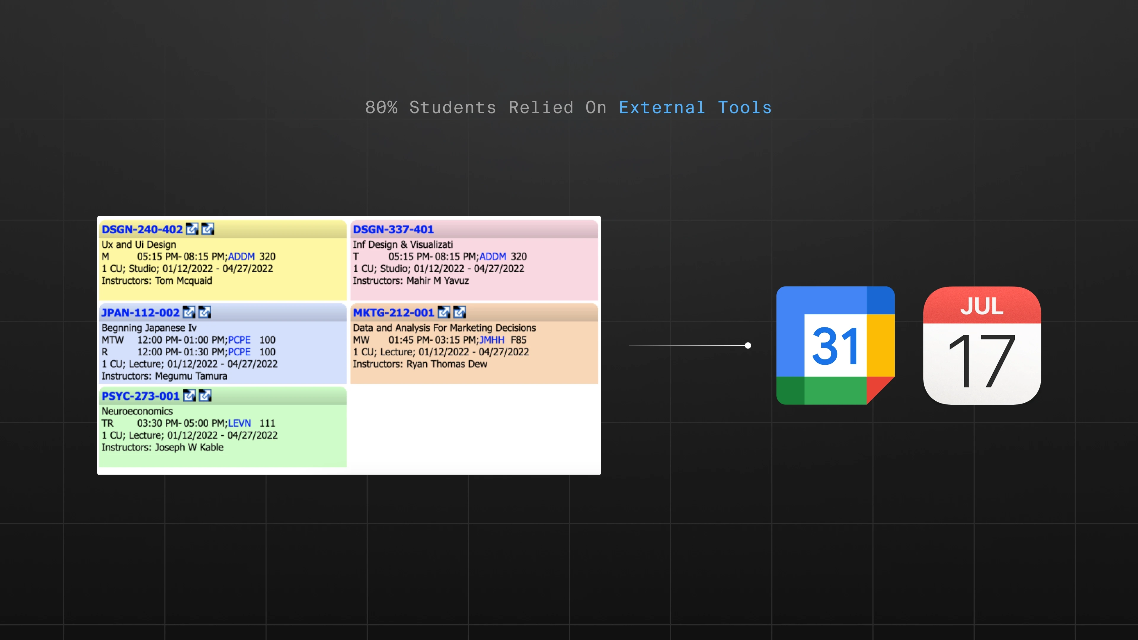 During testing, 80% of participants used external tools while registering. Many manually blocked time slots in Google Calendar to check scheduling conflicts before enrolling in a class. This fragmented workflow forced students to constantly switch between tools.