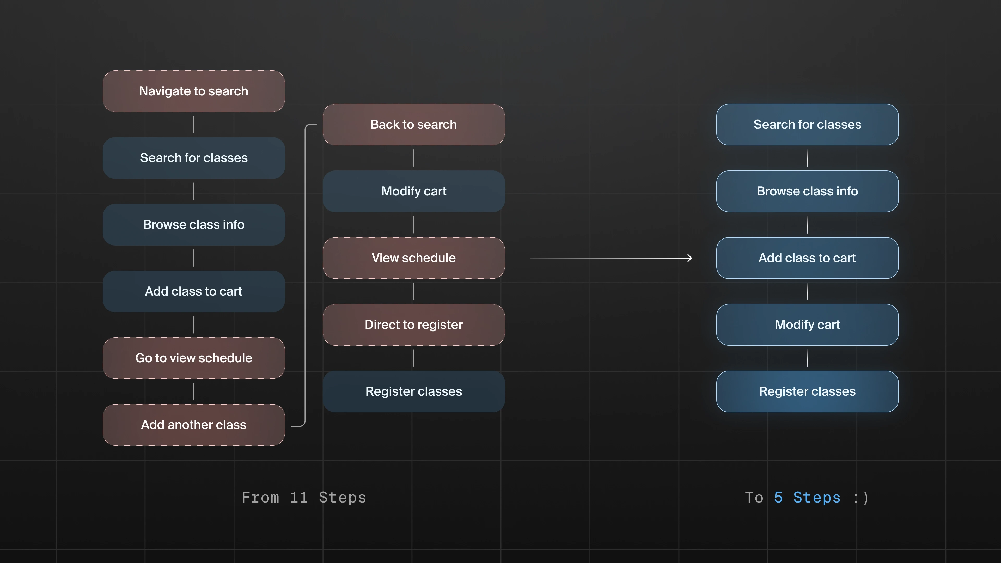 I mapped the full registration journey from course discovery to enrollment, identifying unnecessary navigation and duplicate actions. By restructuring the flow, I reduced the process from 11 steps to 5, allowing students to complete registration more efficiently.