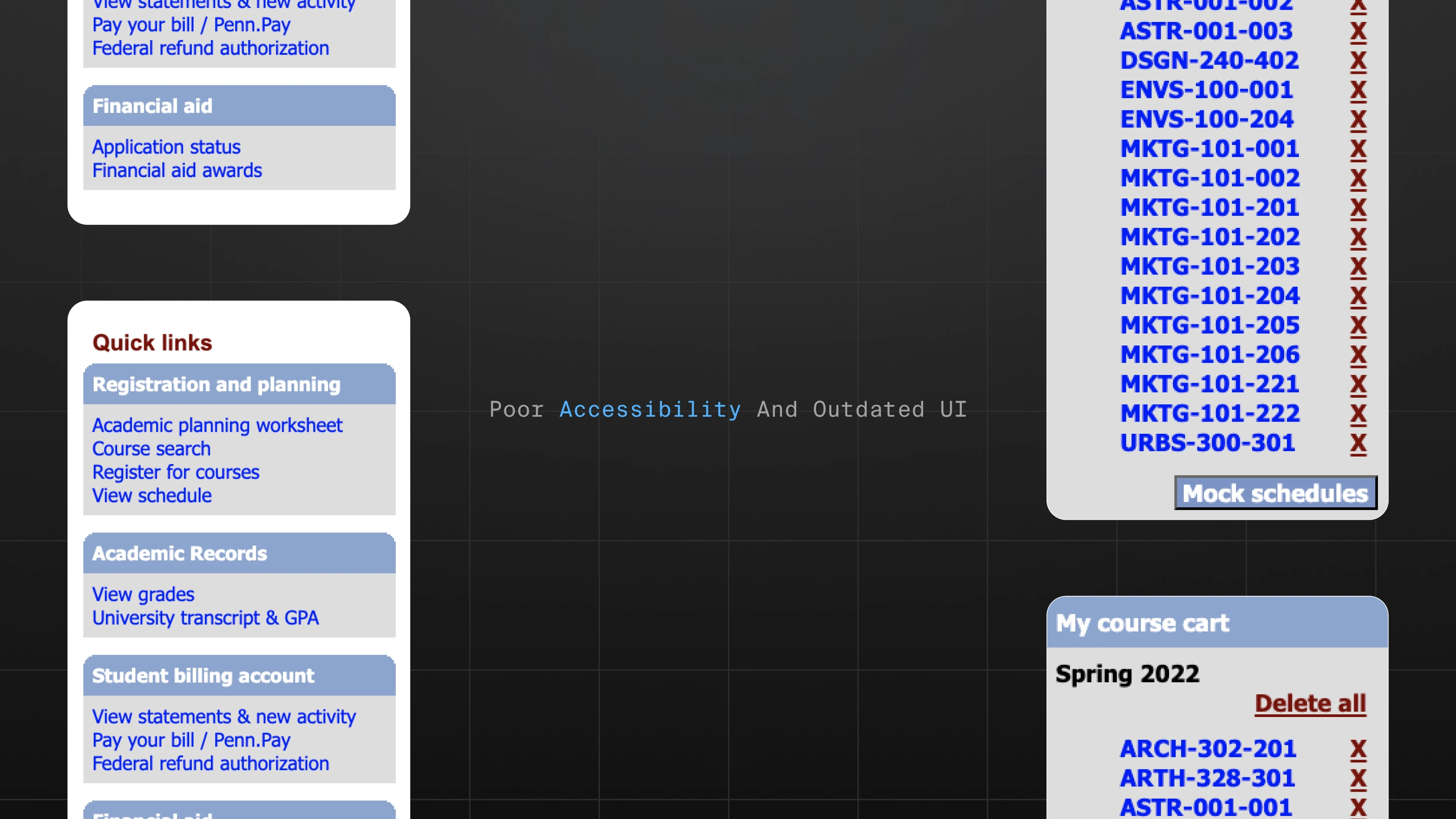 The existing interface suffered from low contrast, cluttered layouts, and outdated visual patterns. Key actions were difficult to locate, and the cart experience was especially confusing, causing many students to abandon it altogether.