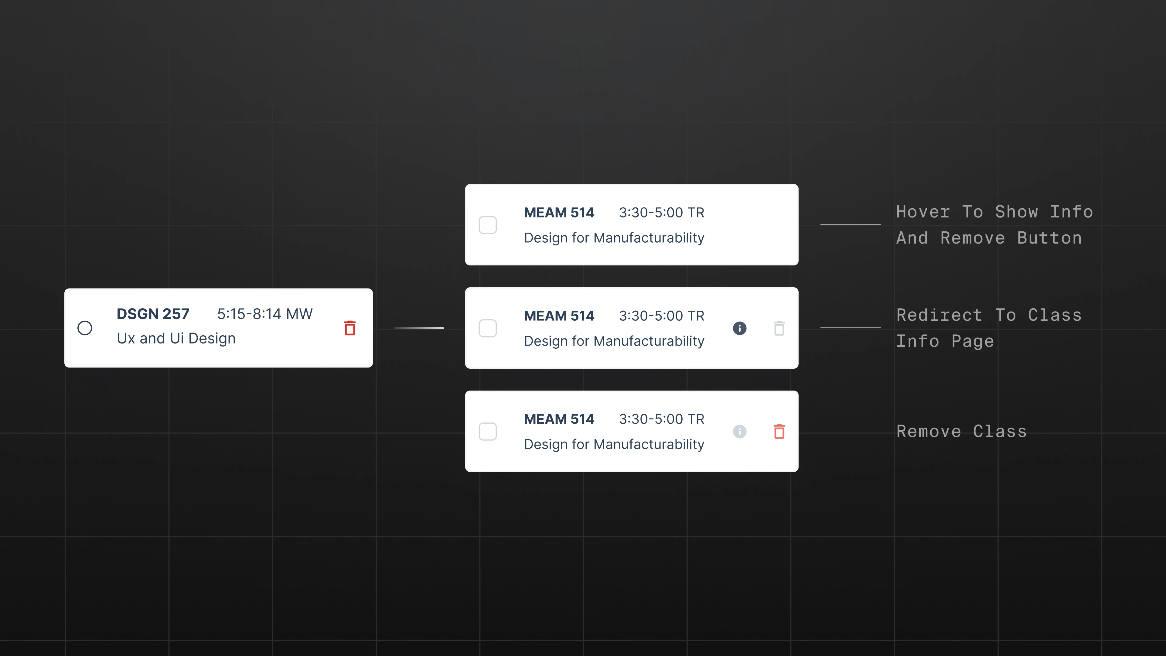 To reduce visual clutter while maintaining functionality, secondary actions now appear on hover. I also introduced a quick “Info” shortcut from the cart to access course details.